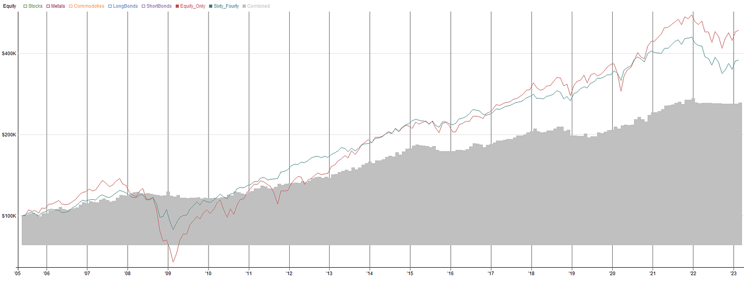 At the very least it should out perform the classic 60/40 portfolio, the demise of which had been most celebrated in 2022. Read on as I break down the implementation and if you’re make it all the way to the end, I’ll even drop some back-tested equity curves.