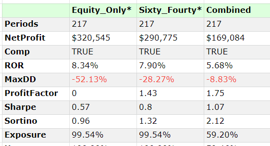 Let’s think about the results for a second. First, the equity only portfolio has the benefit of a strong secular trend for most of the test period and we have no way of knowing if that equity trend will continue into the future (hence the diversification). Second, take a look at some of my favorite stats for these three tests: